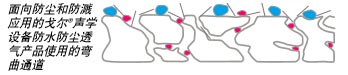 如需防浸水效果,可使用聚氨酯、硅胶或PEEK等无孔膜覆盖这 些孔隙。这些膜既能满足声音传输的要求,防止灰尘和液体浸 入。但这些材料无法“呼吸”。随着前腔室中的压力累积(由 温度或高度变化引起),声学器件柔性表面上的压力会增加。 这种压力会造成声学器件偏置,导致音质和声学器件性能显著降低。